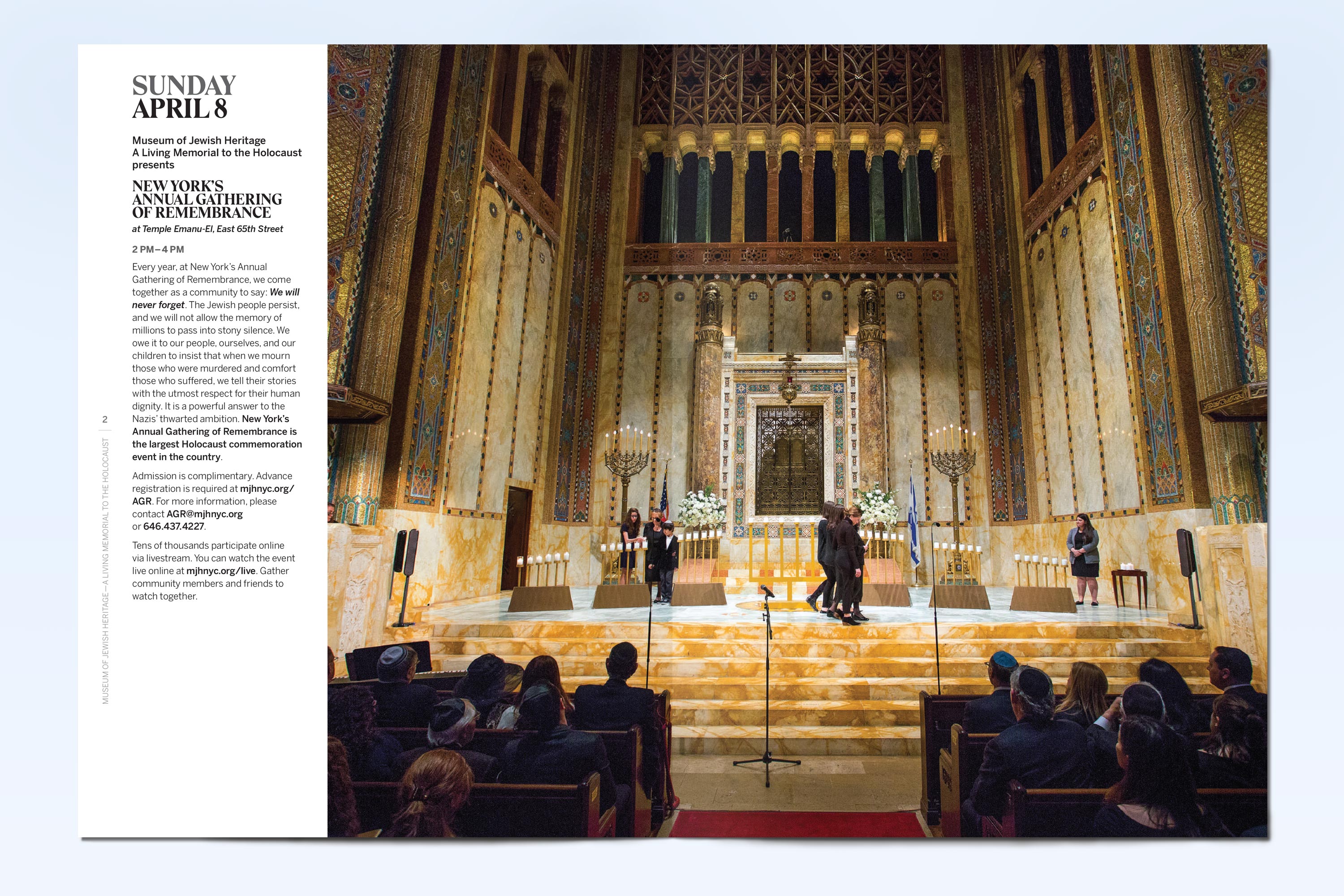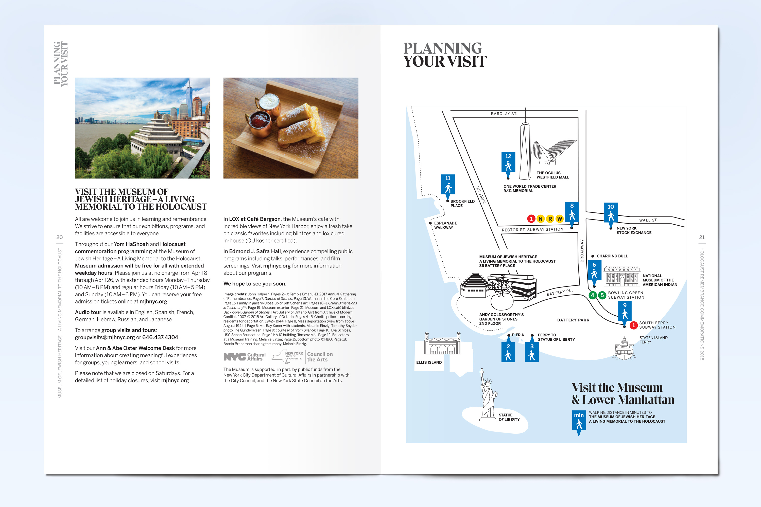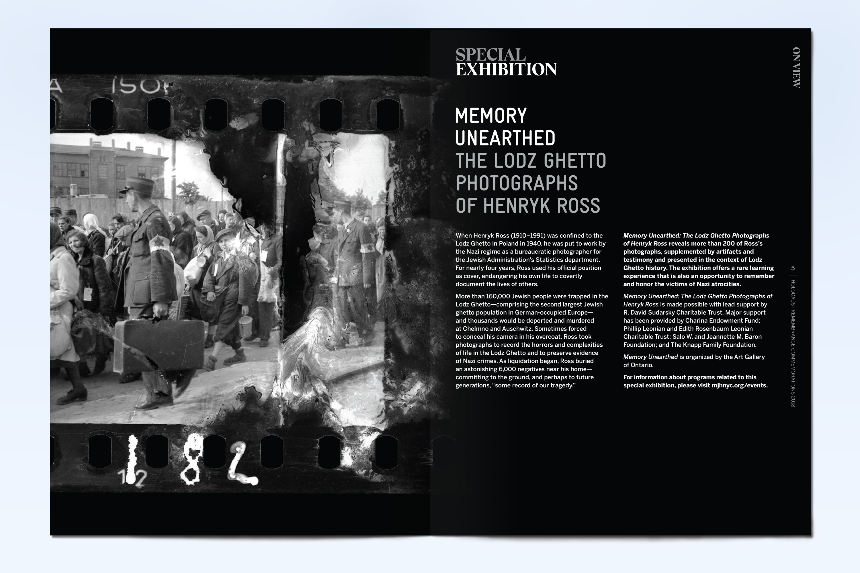 Every April, in connection with the museum’s Annual Gathering of Remembrance, an event held at the 2,500-seat Congregation Emanu-El on NYC’s Upper East Side, an offset-printed booklet usually of 24pgs. was distributed as well as mailed to the museum’s membership base, and made available in the museum’s lobby. Featuring exhibitions, programs, and performances for the season, the booklet also touted initiatives and partner organizations working out of the museum’s Battery Park City (Lower Manhattan) facility. For 2018, Memory Unearthed was a featured photography exhibition showcasing a cache of buried negatives made from within a Polish ghetto during the Holocaust.
